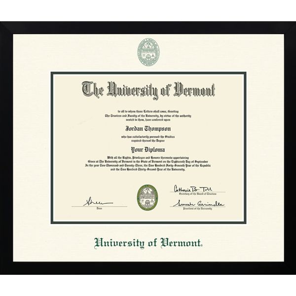 An industry-exclusive, state-of-the-art dimensional color process makes the University of Vermont's Seal and wordmark pop against the textured ivory and Williamsburg green museum-quality matting. Shown in our Gotham moulding, madr from 100% recycled wood and featuring a black satin finish.. Available in Bachelor's size only. A shipping charge of $24.99 per frame will be applied. Frame is designed for those who graduated in or after 2004. For graduates before then, a special sized frame is required. Please call for details.