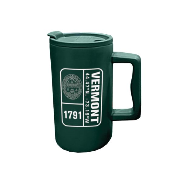 27 oz. double-wall, copper vacuum-insulated 18/8 stainless steel mug from Spirit Products keeps liquids icy or hot for hours! Tumbler features a large handle and push-on drink-thru lid with a rectangular imprint with the University Seal, "Vermont," and 1791 established date,