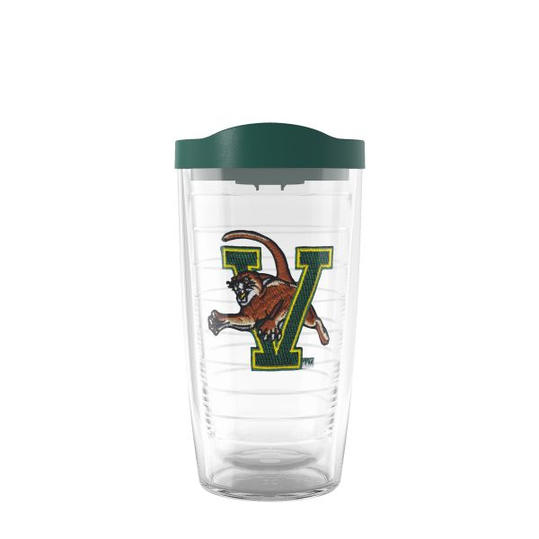 16 oz. Tervis tumbler features double-wall insulated construction that keeps drinks hot or cold longer and reduces condensation to prevent rings on your table. Made from a strong, impact-resistant and BPA-free material, the tumbler won't shatter and is microwave, freezer, and dishwasher safe and fit most cup holders. Tumbler has a green travel lid with slide closure and a contiured lip and a woven V/Cat patch between the double walls.