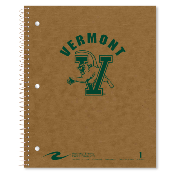 UVM branded one subject, wire-bound notebook with college ruled paper from Roaring Spring. Kraft paper notebook is imprinted with a dark green "Vermont" arched over the V/Cat logo on the front cover. Notebook measures 9"x11" and includes one pocket on the inside of the cover.