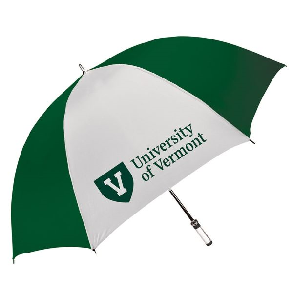 Two tone golf umbrella from Storm Duds provides a generous 62" of coverage. Features a quality manual fiberglass shaft with Storm-flex ribs and spreaders, a windproof design, color-coordinated I.D. handle, matching nylon sheath, and the V Shield and University of Vermont name imprinted on one of the panels.