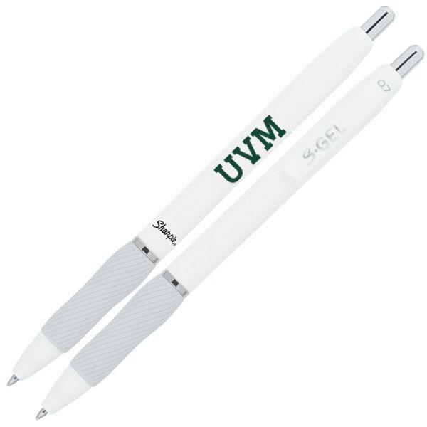 White Sharpie® S-Gel features an opaque, plastic barrel with chrome accents and a rubber grip for comfort while writing. Pen is retractable, with a medium point, black gel ink, and a dark green "UVM" printed on the barrel.